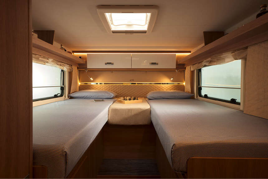 Durch die serienmäßige Isolierung aus extrudiertem XPS, die Warmwasserheizung (Option nur für einige Modelle ), die Isolierung des Grauwassertanks (Komfortpack Kosmo) ist die Serie Kosmo für jedes Klima geeignet.